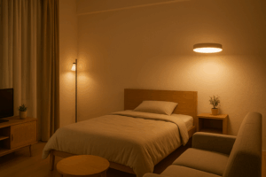 ワンルームでは、同じ空間をリビングにも寝室にも使うため、照明で“ゾーン”を分ける意識が必要です。リビングエリアでは白色〜昼白色の明るめの光、寝室エリアでは電球色の柔らかい光を選びましょう。