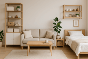 収納家具は高さや奥行きを部屋に合わせて選ぶのがポイントです。特に壁面を使った縦型収納が有効です。
