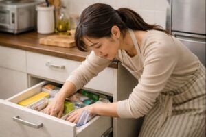 毎日の料理の中で、小さな使いにくさを感じたときも見直しのサインです。ラップを取り出すたびに手間取ったり、戻しにくいと感じたりした場合は、収納が今の生活に合っていない可能性があります。