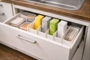 仕切りやケースを使って、一本ずつ定位置を作っておくと、使ったあとも迷わず元に戻せます。サイズ違いのラップがある場合は、仕切りの幅を少し調整するだけでも、見た目が整いやすくなります。また、引き出しの奥行きを活かして、よく使うものを手前に配置するのもおすすめです。