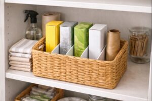 かごにまとめて入れると、ラップのパッケージが直接見えにくくなり、棚の中がやさしい印象になります。素材感のあるかごを選ぶことで、収納そのものがインテリアの一部のように感じられることもあります。